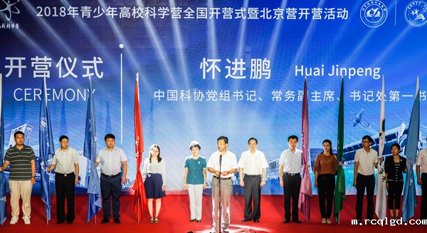 林蕙青、徐延豪分别向北京大学、清华大学等16个分营代表授予营旗。怀进鹏代表主办单位宣布2018年青少年高校科学营开营。