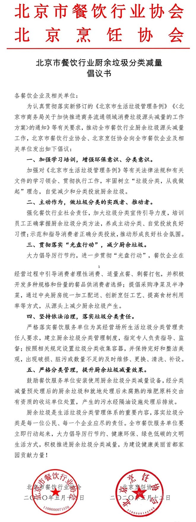 北京市餐饮行业厨余垃圾分类减量倡议书