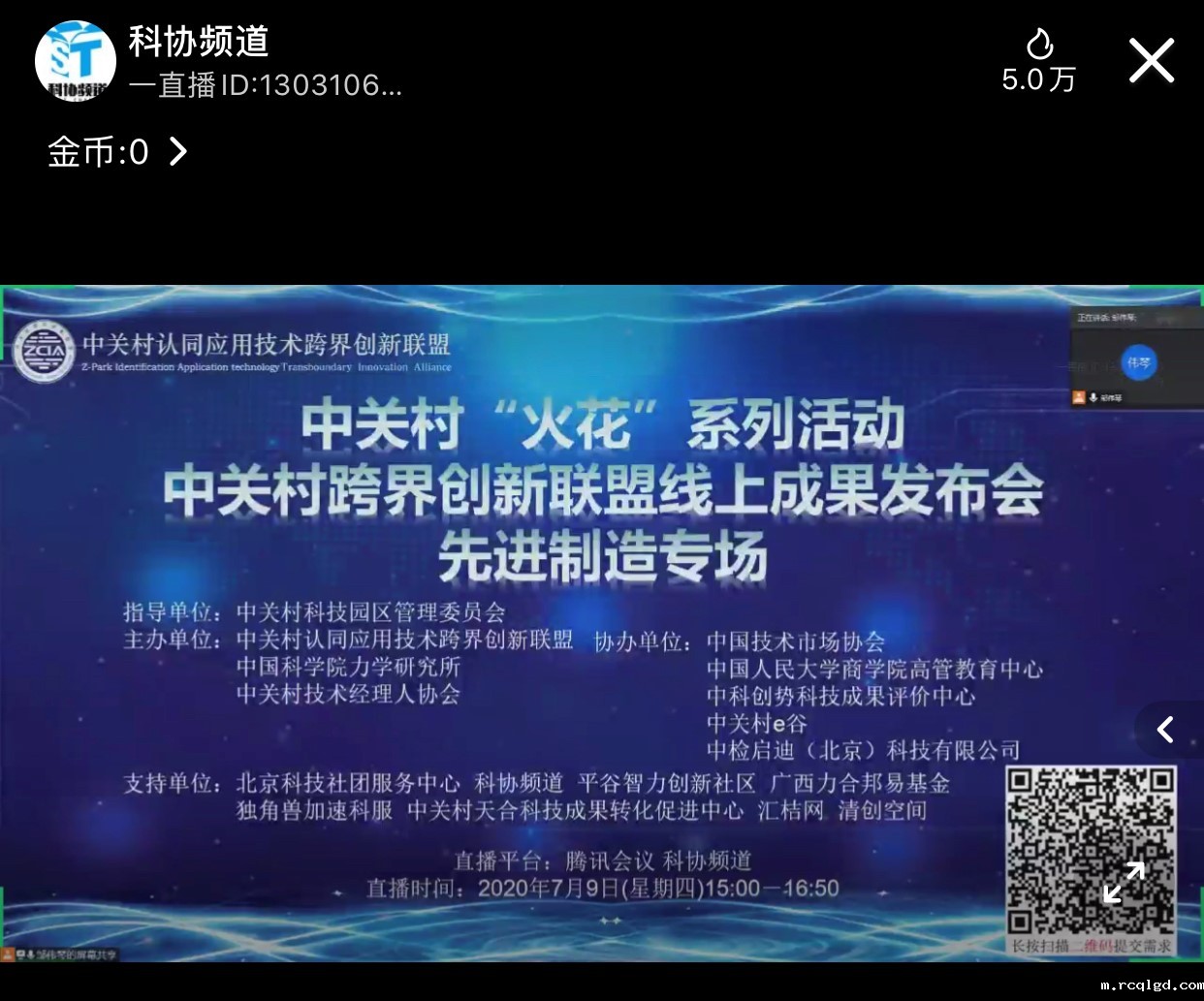 2020年7月9日下午,中关村跨界创新联盟与中国科学院力学研究所在中关村科技园区管委会的指导下,在北京科技社团服务中心等单位的支持下,从企业技术需求出发,联合中关村技术经理人协会等多家单位,成功举办了中关村“火花”活动—中关村跨界创新联盟线上成果发布会—先进制造专场。本次活动发布了中科院力学所先进制造领域的4项待转化的成果,来自政府部门(包括经信局、科技局、招商局、科协、科委等)、企业负责人、投资机构、技术转移服务机构等130多人通过腾讯会议参与了直播互动活动,科协频道新浪微博直播平台观看人次累计达到5万。
