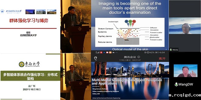 南非比勒陀利亚大学夏小华教授,华北电力大学肖峰教授,德国比勒费尔德大学洪堡人工智能讲席教授金耀初教授,山东大学徐娟娟教授,北京航空航天大学邓岳教授,波兰雅盖隆大学Maciej Ogorzalek教授,东南大学温广辉教授,新加坡南洋理工大学王郸维教授分别作了题为“Distributed consensus problems in energy systems”“多智能体系统的异步性、分布式优化与博弈”“Morphogenetic self-organization of swarm robots”“Stackelberg solution for a two-agent rational expectations model”“群体强化学习与博弈”“Pattern recognition in computer-assisted skin cancer diagnosis”“多智能体系统合作强化学习:分布式架构”“多源异构智能感知技术与非结构环境无人系统”的特邀专题报告。线下和线上的参会代表围绕报告内容开展了广泛的交流,并对新一代人工智能背景下多智能体分布式控制与智能感知决策存在的难点以及未来可能的研究热点进行了深入的探讨。