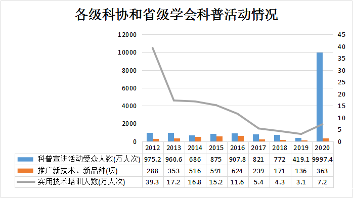 各级科协和省级学会举办科普宣讲活动[25]3638场次,其中专家科普报告会1392场次,专题展览423场次,科技咨询909场次,全国科普日、科普周活动539场次。科普宣讲活动受众人数9997.4万人次,其中全国科普日、科普周活动受众人数9315.2万人次。参加各类科普活动的科技人员3.4万人次,参加各类科普活动的学会、协会、研究会524个次。举办实用技术培训591次,接受培训人数7.2万人次。推广新技术新品种363项。各类科普活动覆盖村(社区)2641个次。
