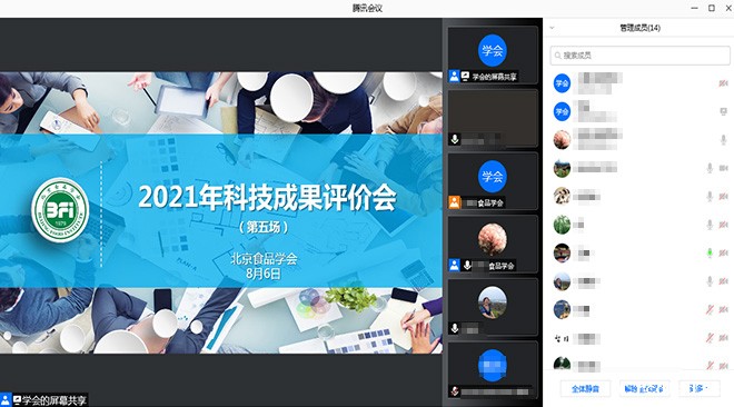 2021年8月6日,北京食品学会(以下简称“学会”)线上召开科技成果评价会。评审委员会由中国农业科学院北京畜牧兽医研究所孙宝忠研究员、农业农村部食物与营养发现研究所王靖研究员、北京市营养源研究所鲁绯研究员、北京食品科学研究院孙勇研究员、新希望六和股份有限公司食品研究院史智佳高级工程师组成,成果评价会由孙宝忠担任评审委员会主任并主持。