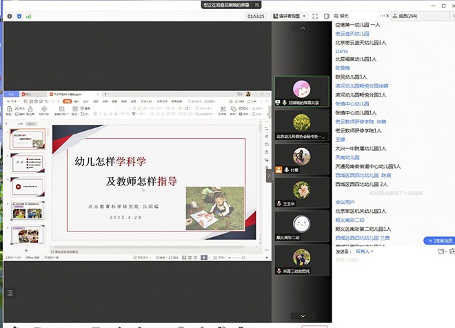 为了提高幼儿教师的科学创新意识,培养幼儿潜心做事、深入思考的品质,体验学科学的乐趣,北京幼儿科普协会于4月28日召开线上专题培训会,邀请北京市早期教育研究所吕国瑶老师作题为“幼儿怎样学科学及教师怎样指导”专题讲座。本次活动由北京幼儿科普协会副秘书长付雁主持,北京幼儿科普协会理事长徐明、秘书长王玉华线上参会并指导工作。来自北京市各幼儿园800余名幼儿教师线上参加了学习。