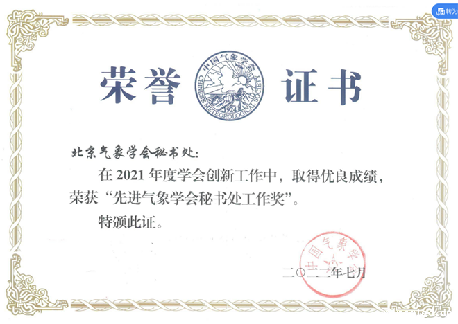 为进一步提升省级气象学会在气象科技交流、科学普及、科技咨询、人才举荐以及推进气象科技事业发展等方面的服务能力,中国气象必威BETWAY官网开展了2021年度“先进学会秘书处”评选工作,2015年以来北京气象学会第六次获得该项表彰。