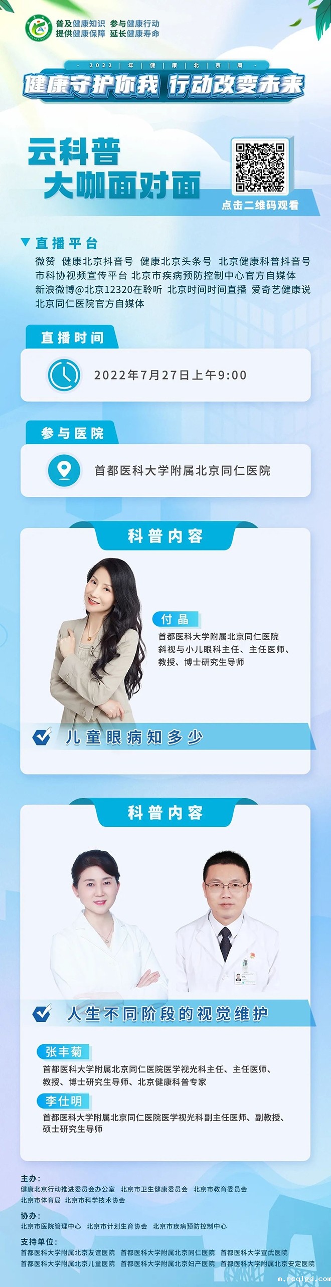7月27日9:00 首都医科大学附属北京同仁医院斜视与小儿眼科主任、主任医师、教授、博士研究生导师付晶,首都医科大学附属北京同仁医院医学视光科主任、主任医师、教授、博士研究生导师、北京健康科普专家张丰菊,首都医科大学附属北京同仁医院医学视光科副主任医师、副教授、硕士研究生导师李仕明将做客直播间,分别为您解惑“儿童眼病知多少”以及“人生不同阶段的视觉维护”等热点话题。北京科协视频号将同步进行直播。