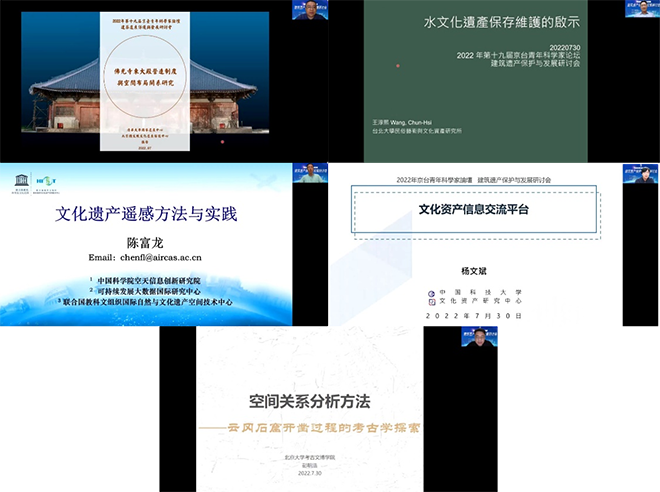 在专题四“建筑考古及其他”中,北京大学考古文博学院研究员彭明浩、中国科学院空天信息创新研究院研究员陈富龙、北京国文琰文化遗产保护中心有限公司高级工程师张荣、台北大学民俗艺术与文化资产研究所助理教授王淳熙、台科大学助理教授杨文斌,分别以《空间关系分析方法——云冈石窟开凿过程的考古学探索》、《文化遗产遥感方法与实践》、《佛光寺东大殿建筑、营造制度与空间关系研究》、《水文化遗产保存维护的启示》、《文化资产信息交流平台》为主题分享报告。