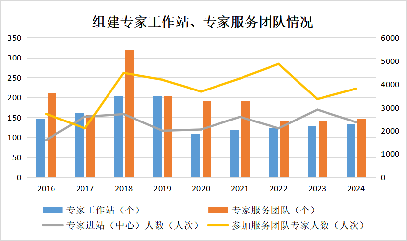 各级科协和省级学会指导组建专家工作站[23]135个,全年组织进站专家2,370人次。组建专家服务团队[24]148个,参加服务团队专家3,815人次。