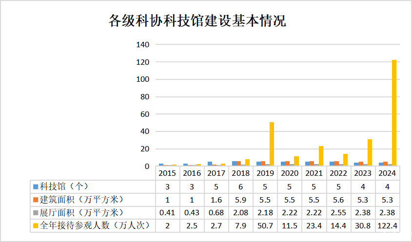 截至2024年底,各级科协拥有所有权或使用权的实体科技馆[29]4个,总建筑面积5.3万平方米,展教面积2.4万平方米,科技馆全年服务122.3万人次。流动科技馆4个。科普大篷车5辆,全年举办活动110场。科普大篷车全年下乡行驶里程3038公里,服务2.0万人次。