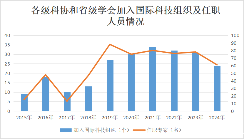 各级科协和省级学会加入国际民间科技组织24个。在国际民间科技组织中任职专家61人。在国际组织框架下参与和发起国际科学计划和工程[36]1项。